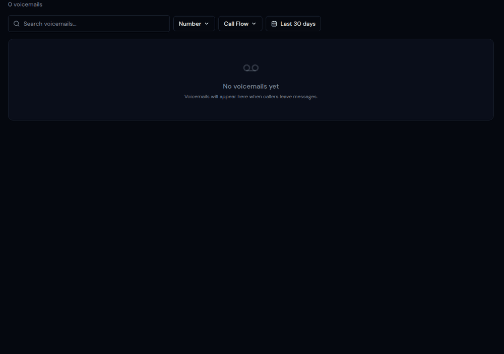 The Voicemails page shows all voicemail recordings left by callers who reached a Voicemail step in your call flows. Each entry shows the caller's number, the tracking number called, the voicemail duration, and a playback button.
